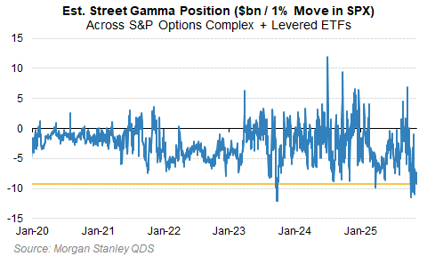 When dealers are long Gamma they tend to hedge against moves, buying as the market sells, and selling as the market buys. When the are short Gamma they do the opposite, chasing moves and exacerbating them.