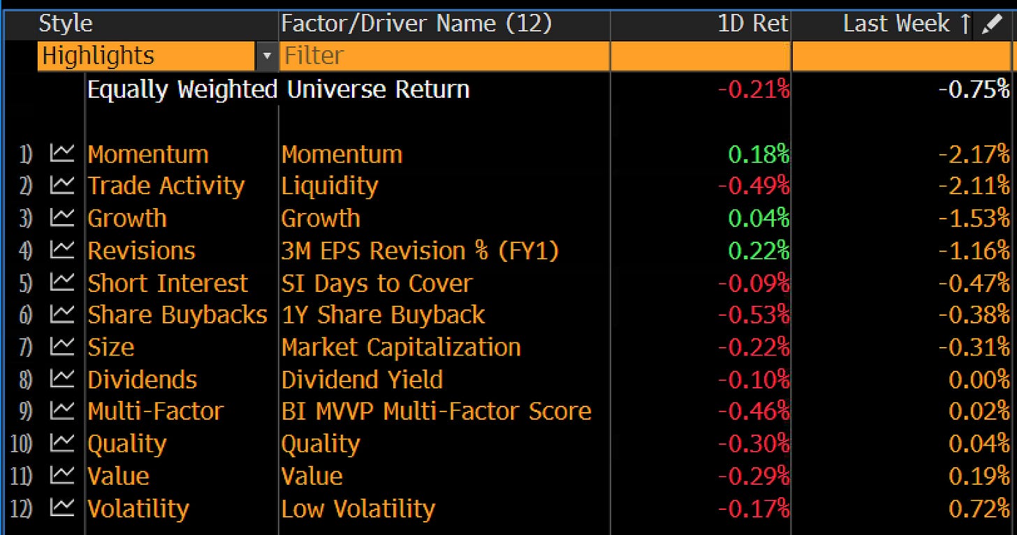 In the factor world (link if you don’t have a good grasp on factors), Momentum and Liquidity (highly traded names) took a back seat to Low Vol and Quality, which means that any form of “hot money” got waxed.
