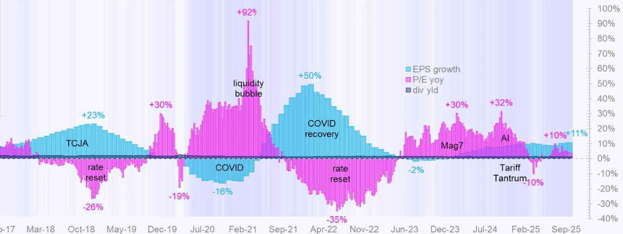 This is an interesting chart showing that we are in a somewhat unique moment where EPS growth is outpacing P/E growth without a rate hiking cycle.