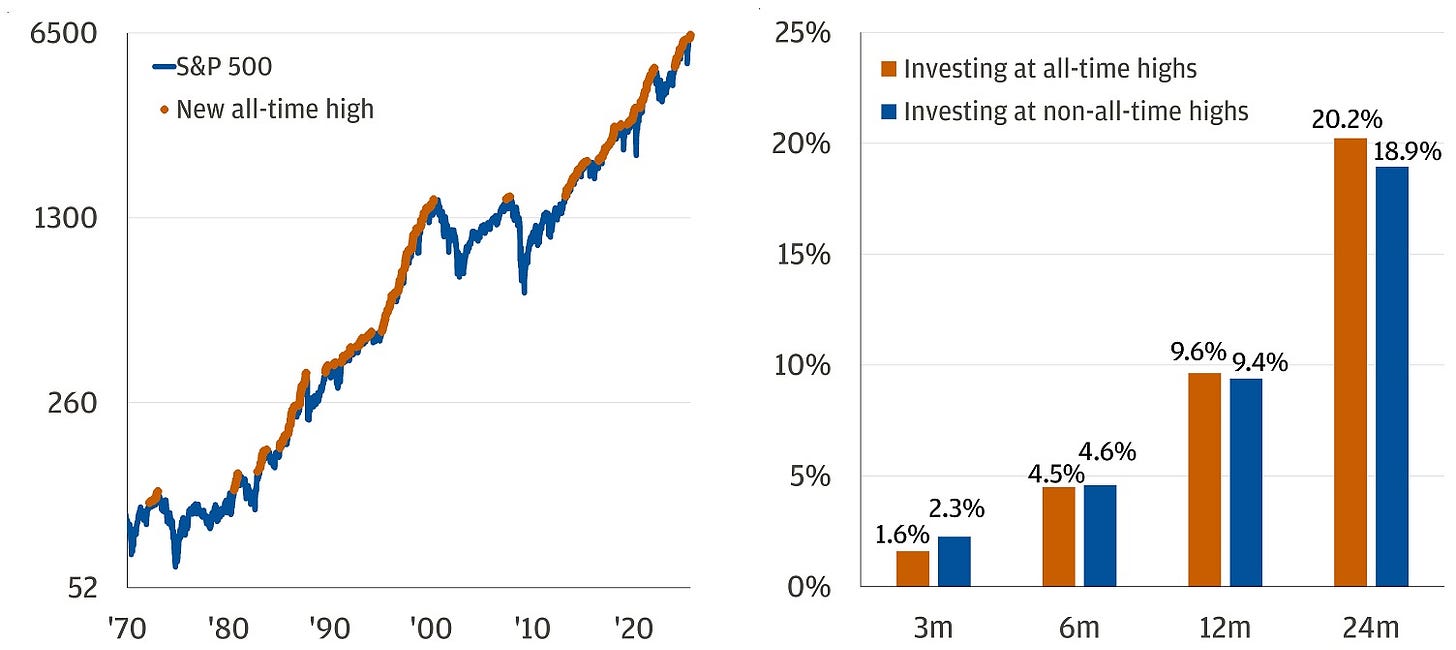 JPM did an analysis of past ATH breaks since 1970 and discovered that buying them is basically the same as buying at any other time. They are ever so slightly more bullish than average on a long-term basis, and slightly less bullish than average on a short term basis. More importantly the data is close enough so as to likely be just noise.