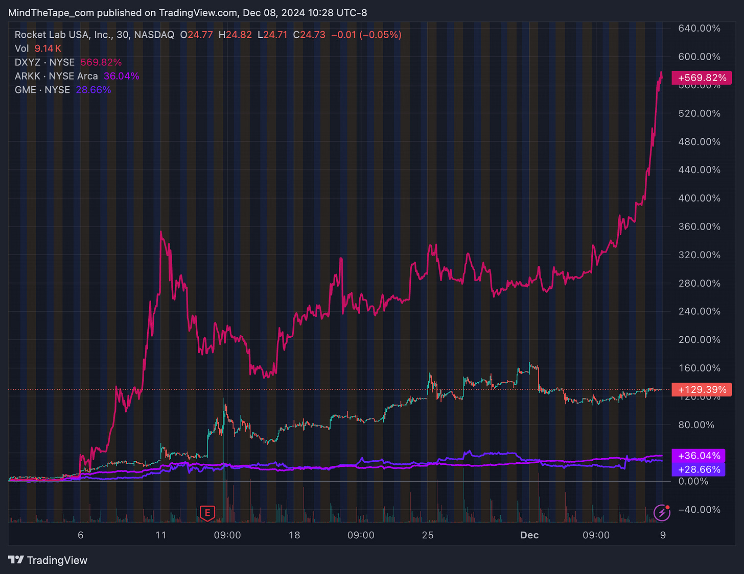 Rocket Labs is up 130%, DXYZ is up 570%, ARKK is up 36%, and GME is up 29%. And that doesn’t even include the crypto meme coins!