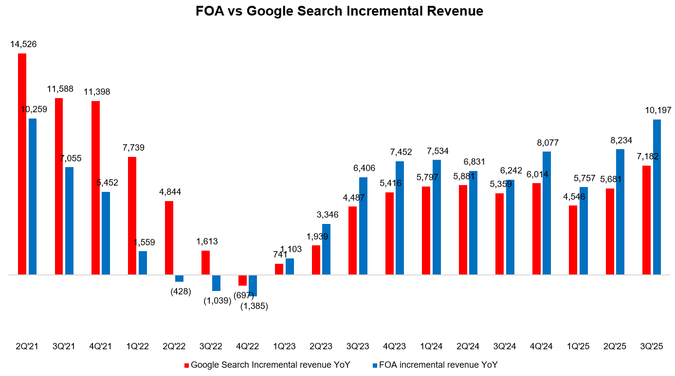 Digging deeper, Meta’s Family of Apps revenue is actually growing faster than Google Search revenue, and has been at an increasing rate since 2023.