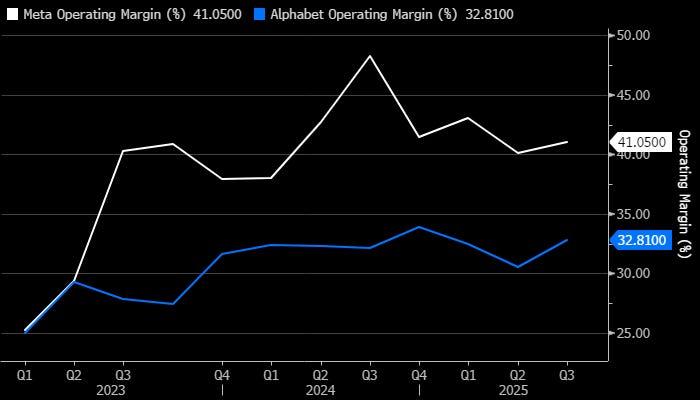 So while Google had an excellent quarter the Meta cash machine actually seems to be spinning up faster than Google’s core business, while operating margins are expanding at a similar pace.