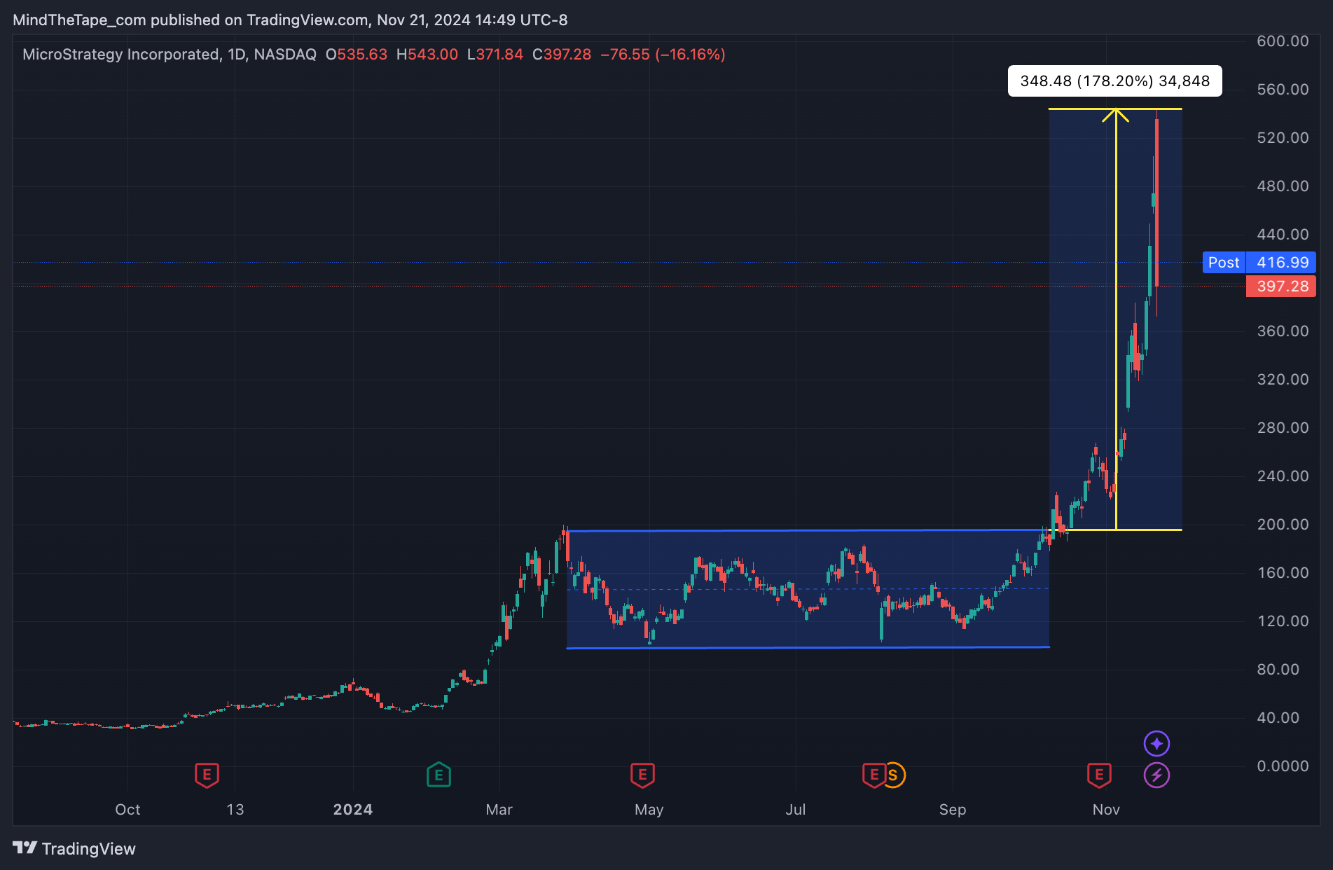 The real hero of this cycle, until today, has been MicroStrategy MSTR 0.00%↑ which broke out 178% beyond its previous all-time highs.