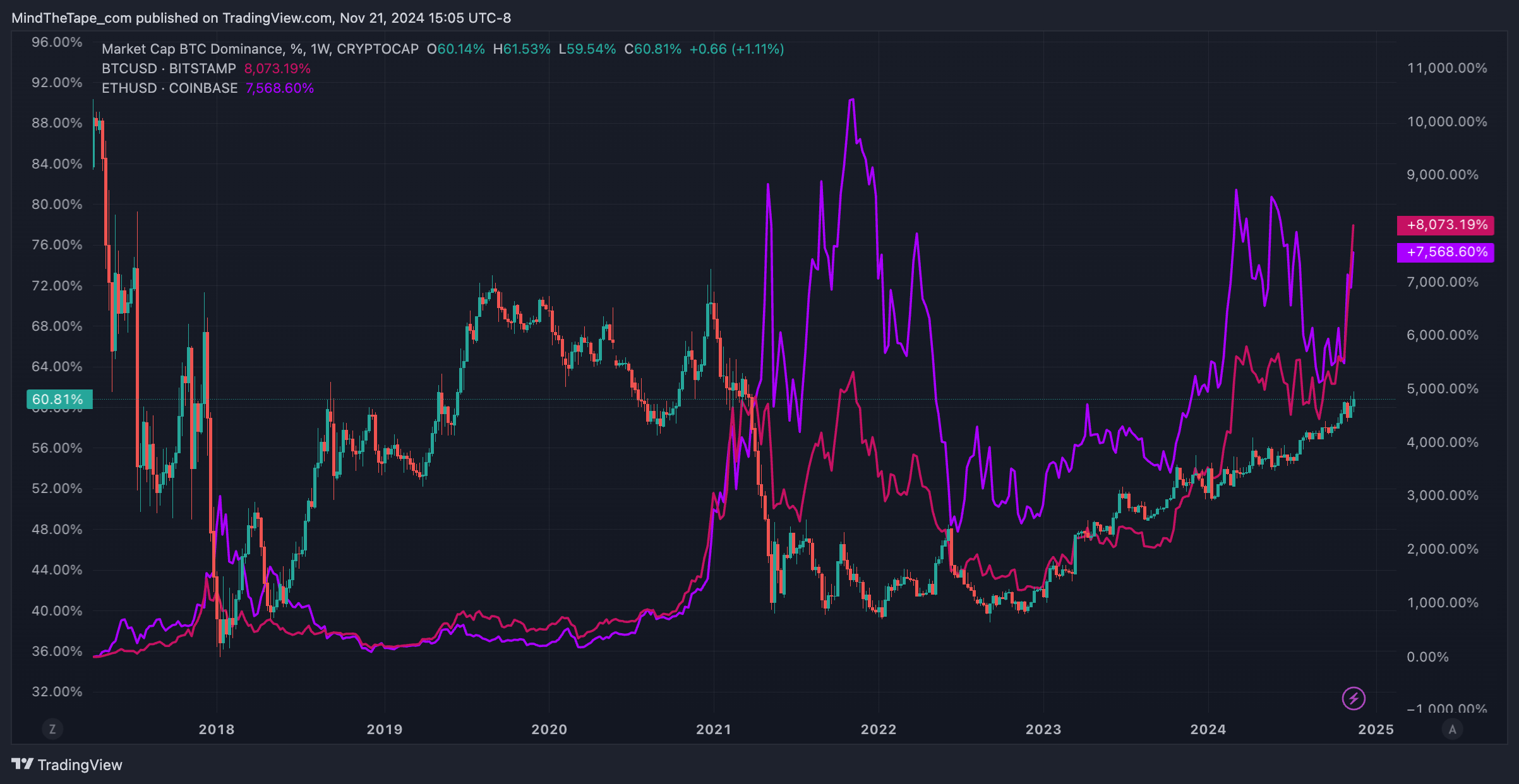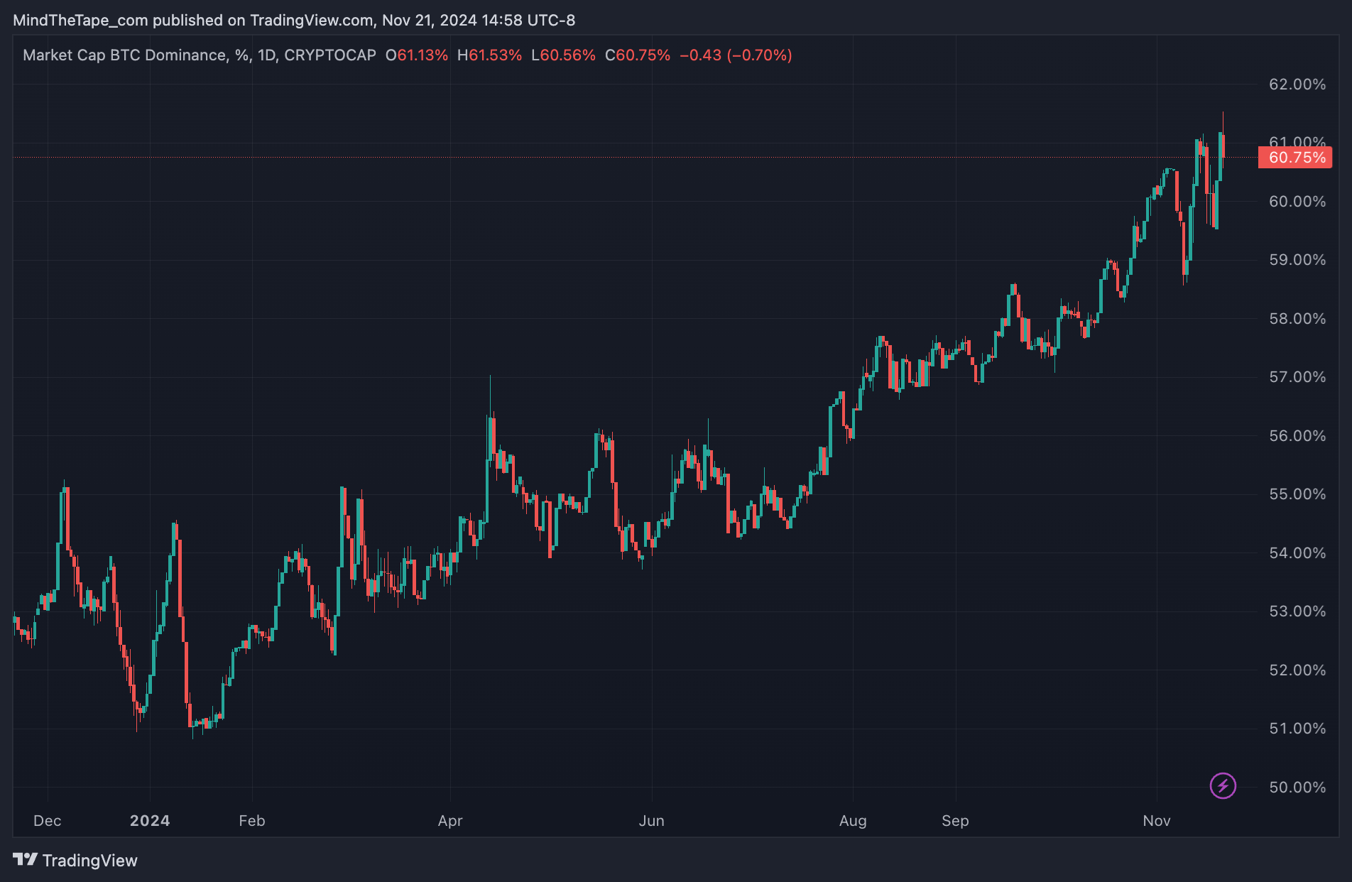 In previous cycles, Bitcoin led other coins like Ethereum, Solana, and the various meme coins early in the cycle. That trend has been even more dramatic this time, with Bitcoin dominance reaching around 60% of the total crypto market cap this week.
