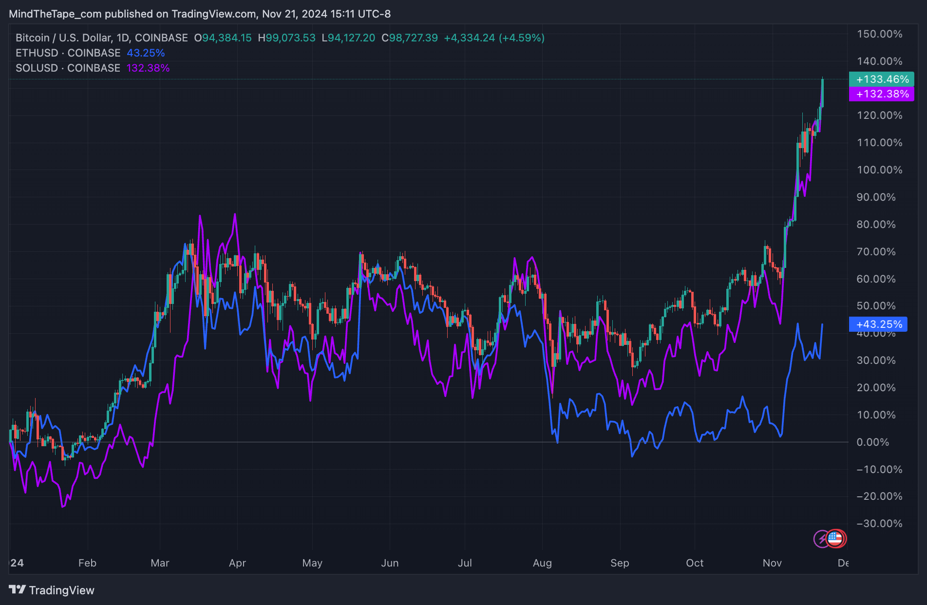 As we might expect, Ethereum has underperformed this cycle. The striking thing, however, is the degree to which Solana has kept up with Bitcoin the entire way.