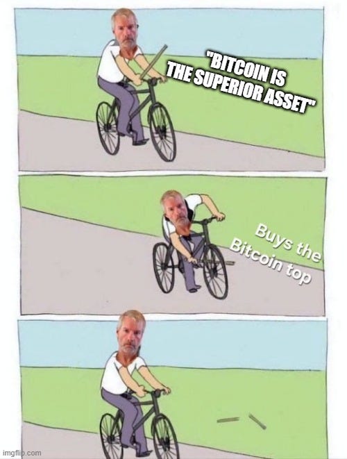 For a while, it seemed like Saylor had found a perpetual motion machine of value creation because for every $1bn in bitcoin he added to his company’s balance sheet, MSTR's market cap went up $3bn!