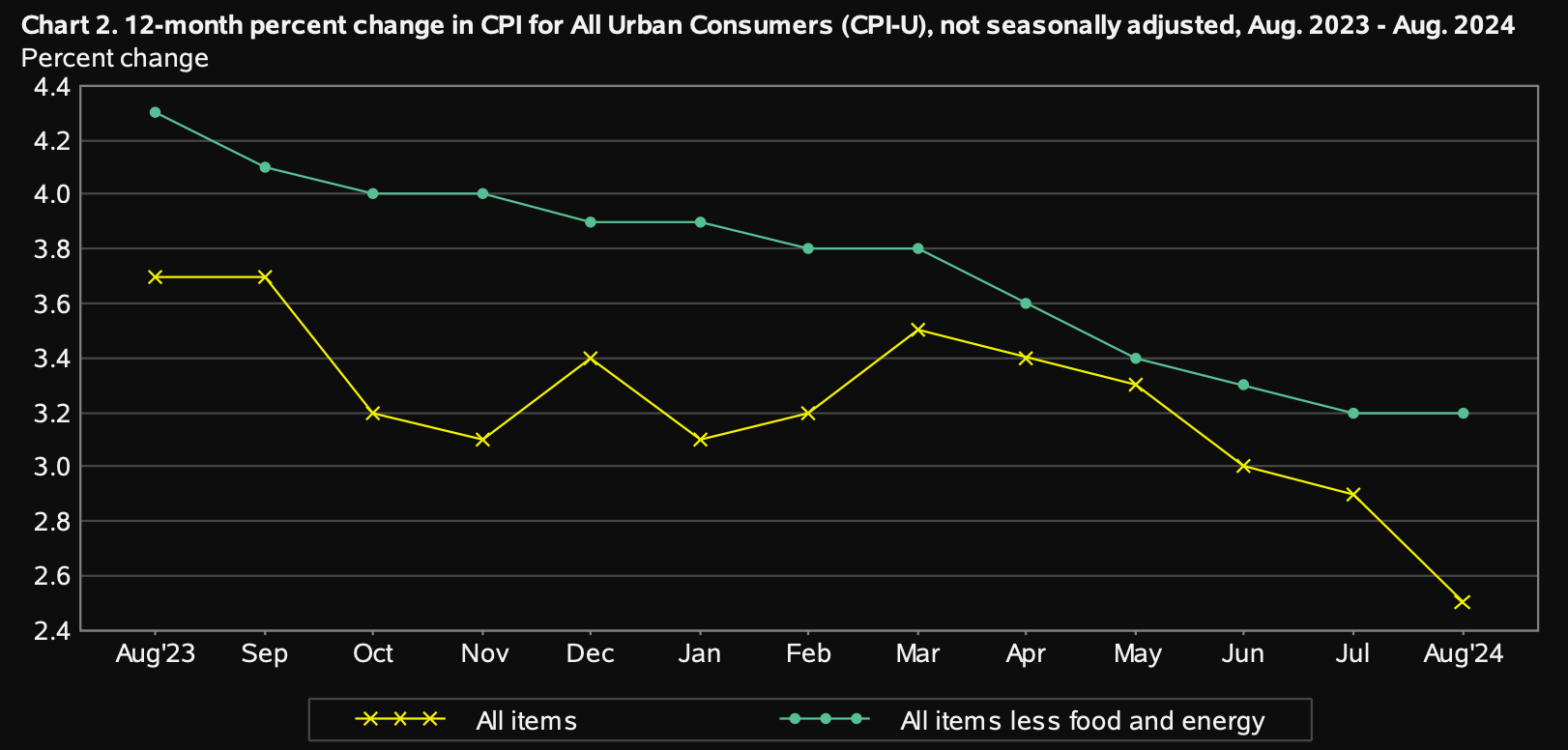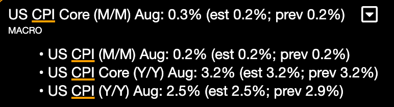 CPI came in right on the money at 2.5%, down from 2.9% in July. Core CPI, which excludes energy and food, came in a touch hotter than expected at .3% M/M, and 3.2% Y/Y.